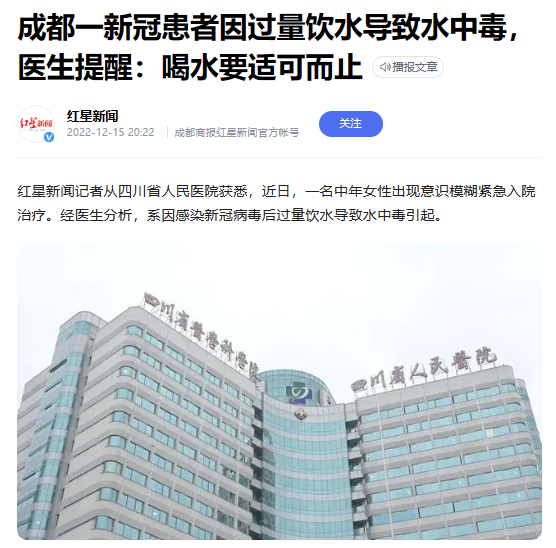 陽”了就要多喝水,這是大家熟知的防治新冠小妙招。然而,喝水也是有講究的,否則可能適得其反,引發(fā)其他問題。近日,一名新冠陽性的女患者就因?yàn)楹人^量,導(dǎo)致“水中毒”,被送到四川省人民醫(yī)院進(jìn)行搶救。什么是“水中毒”水中毒(water intoxication),又稱稀釋性低鈉血癥…
