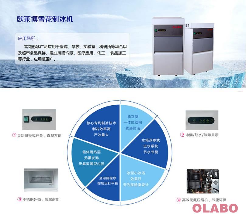 ● 所制冰形為不定形的細小顆粒狀雪花碎冰,冰形小,能滲入較窄間隙, 冷卻速度快,冰浴效果好,專為實驗室設計。