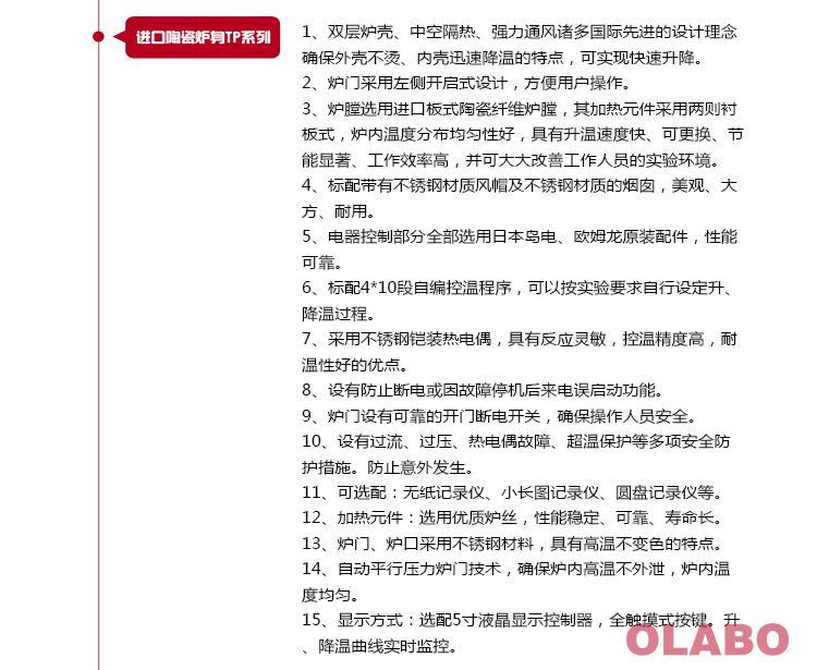4、安全保障措施:本系列電阻爐設有過壓、過流、爐體表面過熱保護保護開關。另設防止供電線路停電恢復后,在無人值守情況下電阻爐繼續加熱功能;及開啟爐門后,爐膛停止供電裝置。